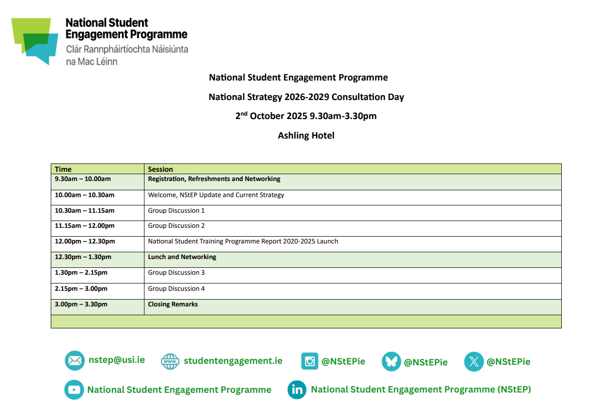 NStEP would like to offer its sincere thanks to all students and staff who attended the Strategy Consultation Day and shared their time and insights. If you would like to be involved in the development of the NStEP Strategy 2026 – 2029, please contact our Programme Manager, Niamh Kennedy, at nstep@usi.ie